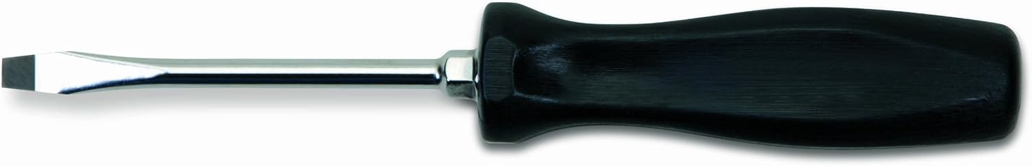 The JH Williams SDR-26 6-Inch slotted screwdriver has an overall length of 10 11/16-Inches and a tip width of 5/16-Inch. The blades are made from special alloy steel for extra strength and the vapor blasted tips grip fasteners and prevents chipping, extending tool life. There is a comfort grip handle with a thumb stop that allows for added turning power without discomfort or slippage. The high polished blade prevents corrosion and can be easily cleaned after each usage.